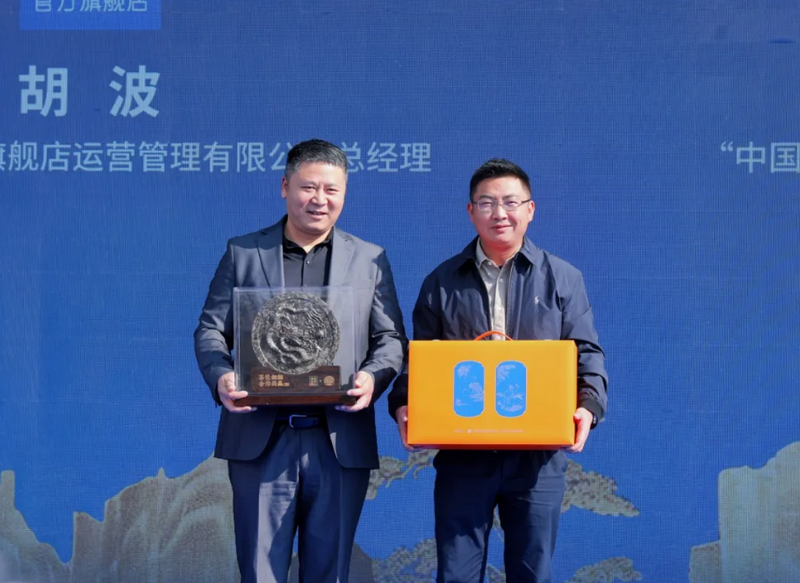 景德鎮官方陶瓷旗艦店運營(yíng)管理有限公司總經(jīng)理胡波與“中國雙江冰島茶薈”官方平臺運營(yíng)CEO段銘春互贈紀念禮品。