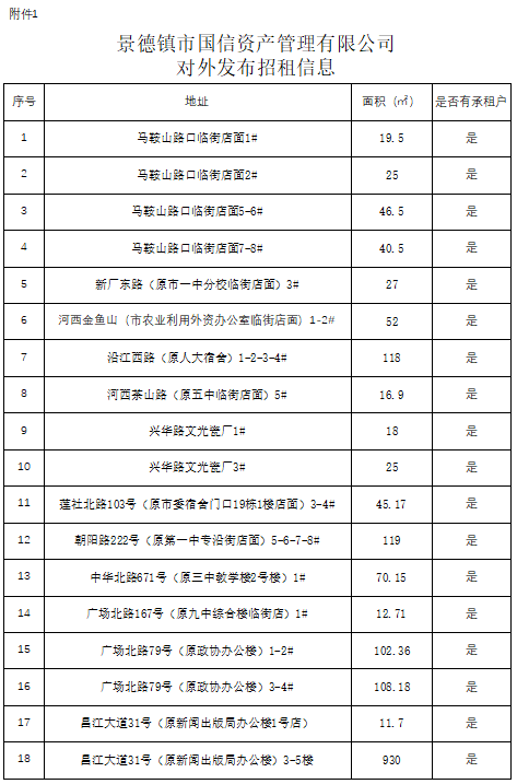 景德鎮市國信資產(chǎn)管理有限公司 對外發(fā)布招租信息[12.13]
