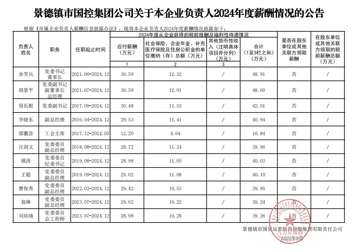 根據《市屬企業(yè)負責人薪酬信息披露辦法》,披露集團負責人2024年度薪酬情況。