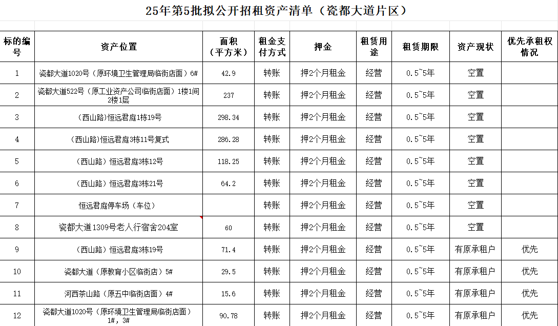 現位于瓷都大道片區資產(chǎn)進(jìn)行公開(kāi)招租,具體招租標的物信息面積詳見(jiàn)《招租清單》。